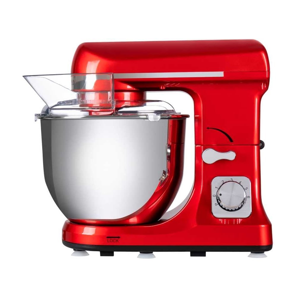 Современный планетарный шестискоростной миксер представляет собой новый тип кухонной техники, компилирующий в себе дизайн и функциональность. Мощный мотор (1000 Вт) помещен в красный корпус, выполненный из высококачественной пластмассы, и позволяет с легкостью использовать все функции данного миксера. Комплект насадок включает в себя: венчик для взбивания, который абсолютно необходим для создания кондитерских шедевров (взбивание белков, масла, крема, суфле); насадка для перемешивания ускорит и сильно облегчит приготовление теста для кексов и бисквитов; крюк используется для вымешивания не только теста, но и, например, фарша. Большая чаша (5 л), выполнена из нержавеющей стали и укомплектованна пластиковой защитной крышкой с дозатором, предотвращающей разбрызгивание при готовке и позволяющей добавлять ингредиенты в процессе. Несмотря на внушительные размеры, чаша с легкостью помещается в посудомойку. В столь мощном миксере предусмотрена защита моторного отсека и противоскользящие ножки.