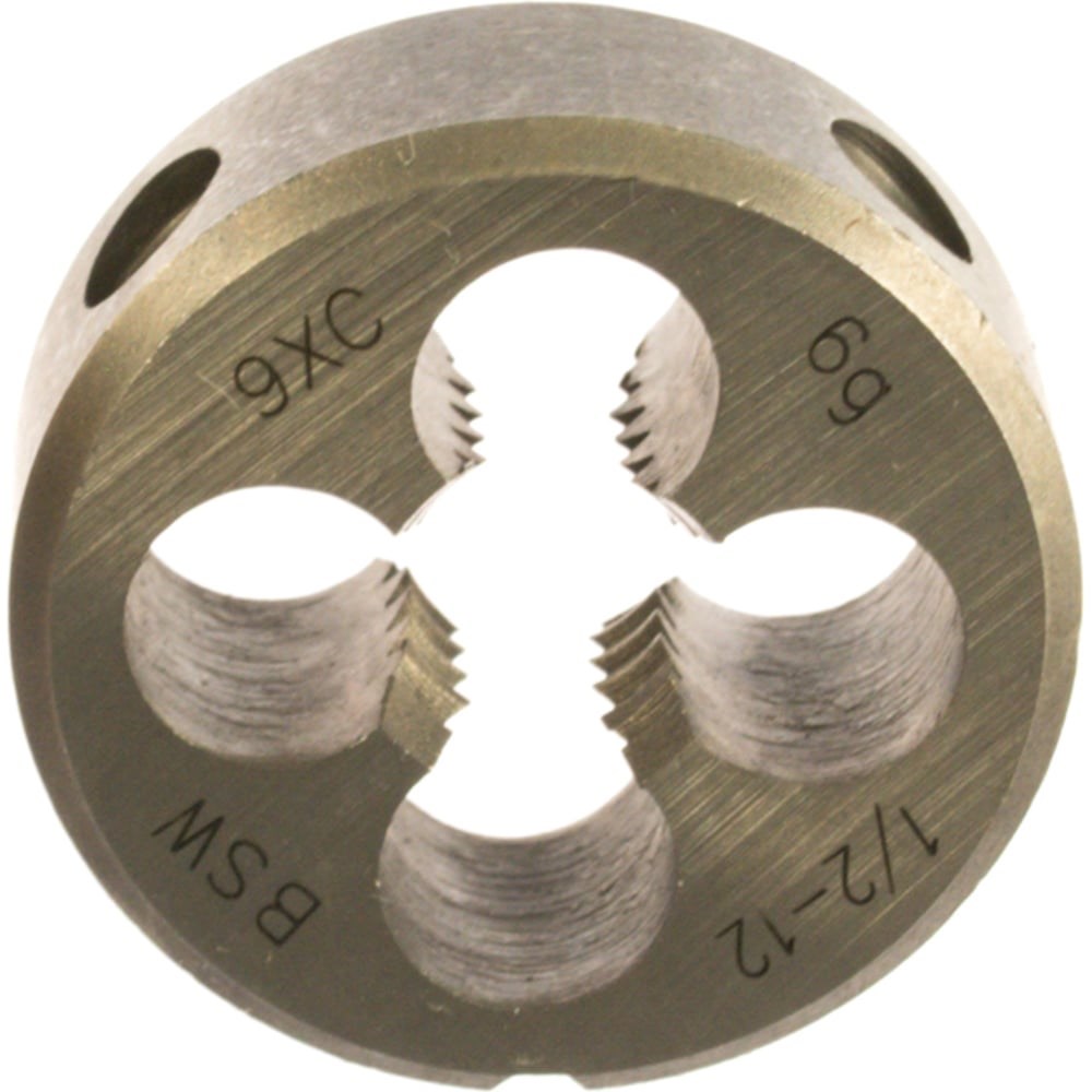 Плашка BSW 1/2 12 ниток STV 00-00000884 используется для нарезания наружной резьбы. Данная модель изготовлена из инструментальной легированной стали и обладает особой прочностью.  Диаметр резьбы 1/2 дюйма. Число витков на дюйм – 12.