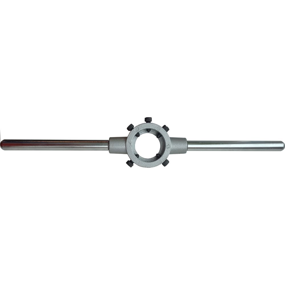 Плашкодержатель ФТ 30 (М10-М11) 186603 предназначен для нарезания внешних резьб плашками. Плашка зажимается в держателе специальными винтами. Съёмные ручки позволяют работать в труднодоступных местах и углах. Выполнен путём литья цинкового сплава под давлением. Общая длина 260 мм.