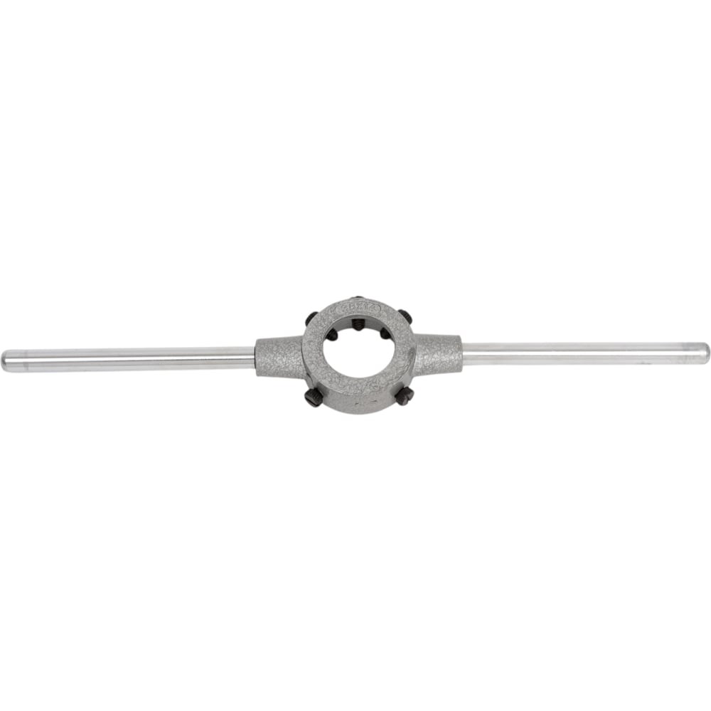 Плашкодержатель ФТ 38 (М12-М14) 186604 предназначен для нарезания внешних резьб плашками. Плашка зажимается в держателе специальными винтами. Съёмные ручки позволяют работать в труднодоступных местах и углах. Выполнен путём литья цинкового сплава под давлением. Общая длина 305 мм.