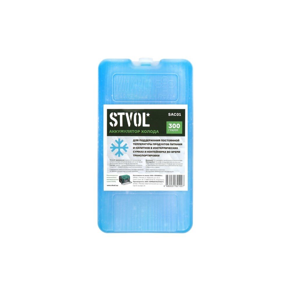 Аккумулятор холода STVOL, пластиковый, 300 гр SAC01 предназначен для поддержания отрицательной температуры напитков и продуктов питания во время транспортировки. Применяется в изотермических сумках или контейнерах. Корпус выполнен из полиэтилена высокой плотности. В качестве хладагента использован жидкий нетоксичный теплоноситель. Аккумулятор подходит для многоразового использования.