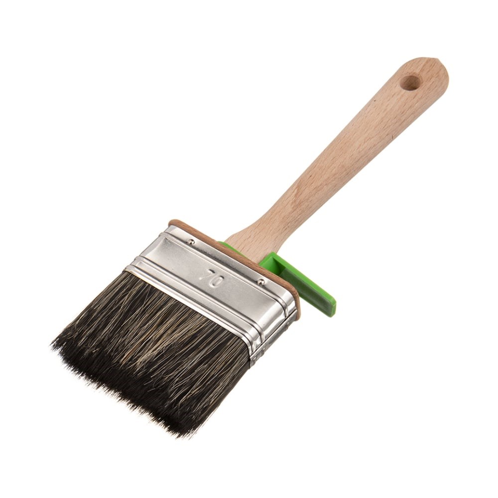 Плоская кисть Лазурный берег для работ с ЛКМ на водной основе и масляных красок, смешанная щетина, 70x25мм КП-70x25 С7 227070 рекомендуются для пропиток, антисептиков, лазурей, грунтовок, идеальны для деревянных поверхностей. Эргономичная рукоятка из бука. Хороший забор, удержание, равномерное нанесение краски.