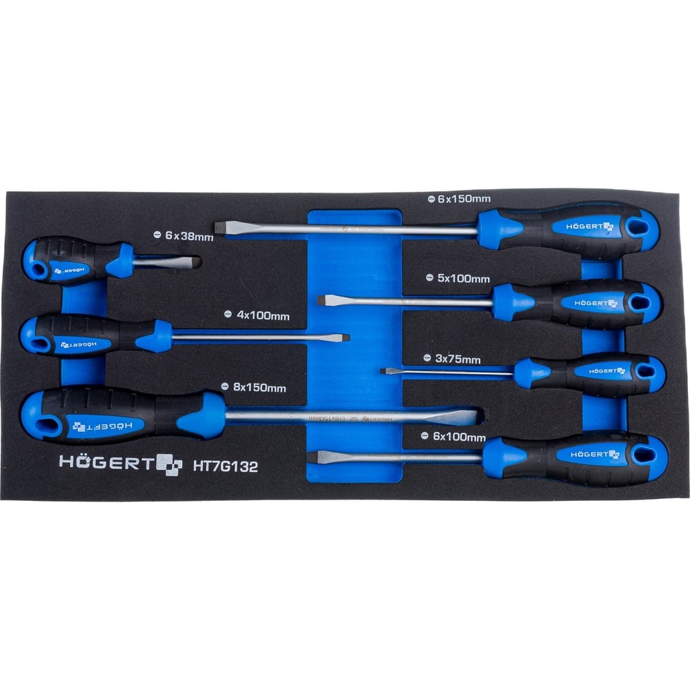 Набор плоских отверток HOEGERT TECHNIK(7 шт.) в ложементе EVA - Порядок и Надежность для Ваших ЗадачОбеспечьте себя полным набором надежных плоских отверток с набором HOEGERT TECHNIK, организованным для максимальной эффективности.Этот комплект, состоящий из семи отверток с прямым шлицем (HT1S001, HT1S004, HT1S008, HT1S010, HT1S012, HT1S014, HT1S016) различной ширины, станет незаменимым помощником в любой мастерской или на производстве.Преимущества:Организованное хранение: Ложемент из EVA-пены обеспечивает надежную фиксацию каждой отвертки, защищая их от повреждений и позволяя быстро находить нужный размер. Идеально подходит для хранения в инструментальной тумбе.Высокая прочность и долговечность: Отвертки изготовлены из высококачественной легированной стали S2, что гарантирует их устойчивость к износу, деформации и высоким нагрузкам.Профессиональный инструмент: Разработаны для профессионального использования, обеспечивая надежный захват и эффективную передачу крутящего момента.Полный комплект размеров: Набор включает в себя широкий диапазон размеров, позволяя решать самые разнообразные задачи.Эффективное использование пространства: Формат вставки в инструментальную тумбу позволяет оптимально организовать рабочее место, сохраняя порядок и обеспечивая быстрый доступ к инструментам.Набор плоских отверток HOEGERT TECHNIK HT7G132 – это инвестиция в качество, надежность и организованность вашего рабочего процесса.