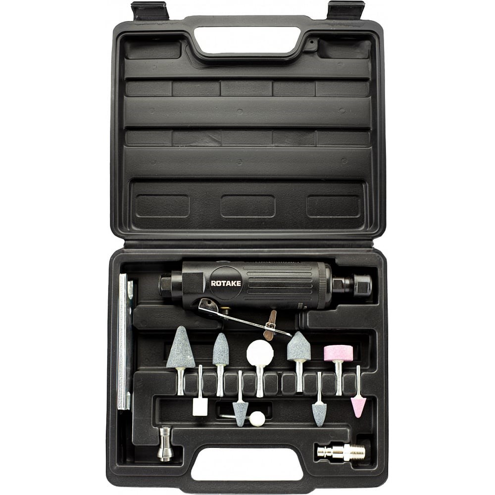 Пневматическая шлифмашинка с набором камней Rotake 22000 об/мин RT-1206K-P применяется для зачистки поверхностей, зачистки сварных швов, срезания металлических заусенцев. Цанговый зажим позволяет устанавливать различные насадки. Комплект состоит из 15 предметов и поставляется в пластиковом кейсе. Корпус шлифмашинки выполнен из стали и легкого композита, что облегчает работу оператора в процессе интенсивной эксплуатации инструмента. Специально подобранная скорость редуктора обеспечивает ее быструю и качественную работу. Для пуска используется курок без фиксации и с блокирующим устройством от случайного нажатия. Такой механизм позволяет экстренно отключить шлифмашинку во время работы. Для длительного срока службы инструмента используйте чистый и сухой сжатый воздух с добавлением специального масла.