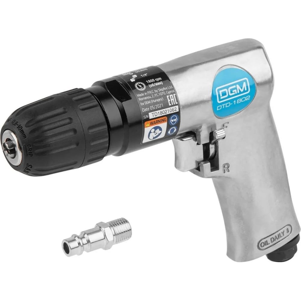Пневмодрель с реверсом DGM DTD-1802 выполнена из алюминия. Оснащена реверсом. Диаметр патрона: 3/8"-24 UNF Макс.диаметр сверления дерева: 20 мм Макс.диаметр сверления металла: 10 мм Минимальный диаметр шланга: 10 мм