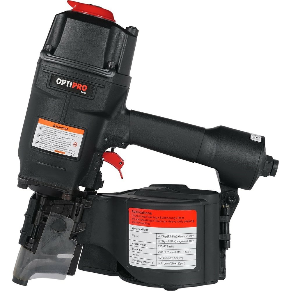 Пневмоинструмент OPTIPRO CN90 CN90PRO универсален и применим для широкого спектра работ. Используется с гвоздями длиной от 50 до 90 мм, диаметром от 2.5 до 3.1 мм. Пневмоинструмент имеет регулировку глубины забивания гвоздя и переключатель режимов работы (пистолет/молоток) Удобная конструкция магазина позволяет сократить время перезарядки инструмента.
