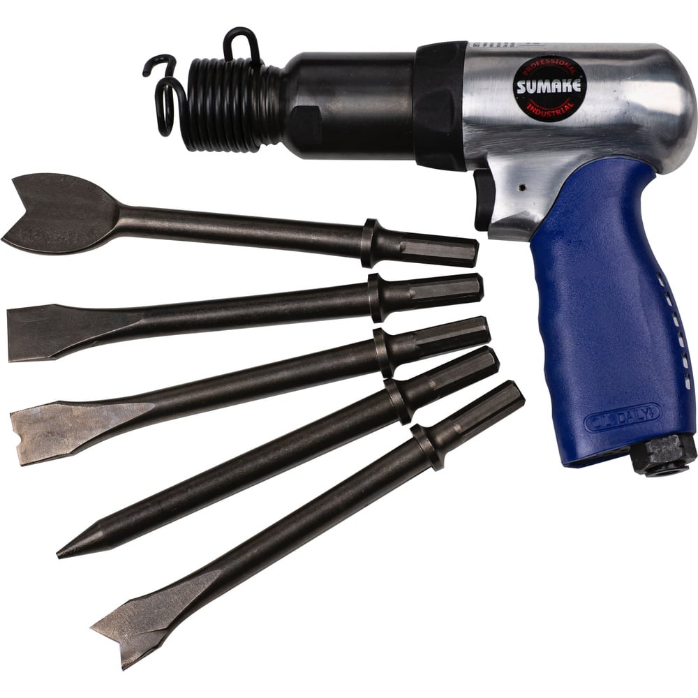 Пневмомолоток SUMAKE ST-M3009K/H + 5 зубил 170 мм 8096330 используется для выполнения несложных долбежных работ, таких, как отбивания плитки и штукатурки. Пневмодвигатель обладает хорошей устойчивостью к перегрузкам, а также позволяет длительное время работать без остановки. Работа на сжатом воздухе обеспечивает инструмент гораздо большим рабочим ресурсом по сравнению с электроинструментом. Модель поставляется в комплекте в пластиковом кейсе с пятью зубилами, что исключает необходимость приобретать их отдельно.