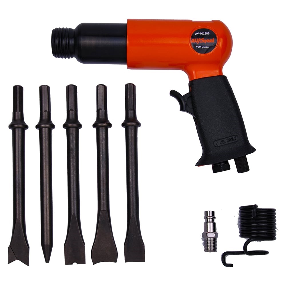 Пневмозубило с набором насадок AV Steel AV-701809 предназначено для демонтажа различных конструкций, выдалбливания отверстий, гнезд и пазов различного размера. Качественный механизм позволяет делать до 3500 ударов в минуту. Ударный момент, создающийся пневмотурбиной, дает ряд достоинств: высокий ресурс, отсутствие перегрева, устойчивость к перегрузкам, возможность работать длительное время, а также высокую пожаробезопасность. Рекомендуется использовать подключение шлангом со внутренним диаметром не менее 8 мм.