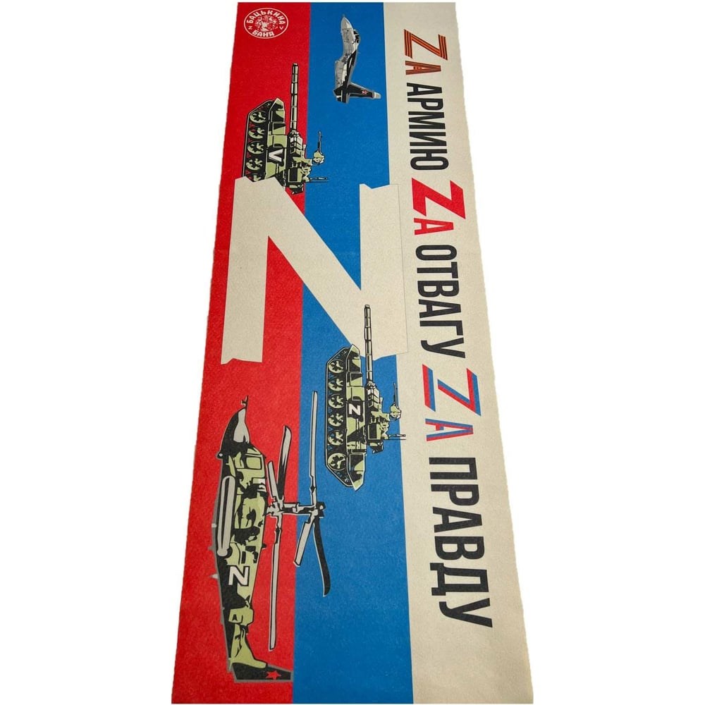 Подстилка ковёр Бацькина баня Скрутка 145x70 см, печать ZA Армию,ZA Отвагу, ZA Правду 10296 с патриотическим принтом имеет увеличенный размер 145 на 70 см. Подстилка для бани и сауны состоит из смесового фетра - это уникальный материал, подходящий для чувствительной кожи, из которого изготавливаются все банные аксессуары. Коврик имеет классическую форму и абсолютно не колючий. Лежак отлично подойдет для отдыха, так как устойчив к высоким температурам, быстро сохнет и не теряет цвет и форму после стирки. Банный коврик с символикой Армия России, станет отличным дополнением в любой банный набор мужской или женский. Это отличный подарочный набор для бани по любому поводу.
