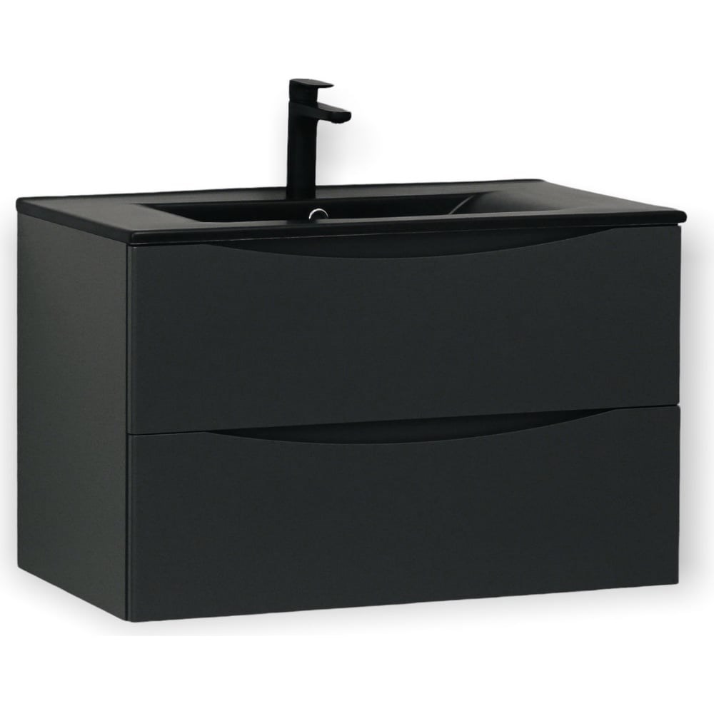 Тумба с раковиной подвесная 80см BOND Cube T01807-S05B. Материал: фасад и корпус МДФ с интегрированными ручками, покрыт высококачественной премиальной краской испанского производства. Цвет - графит (темно-серый) матовый. Направляющие скрытого монтажа полного выдвижения с доводчиками. Внутри ящики серого цвета. Раковина черная в комплекте: BOND S05-808.