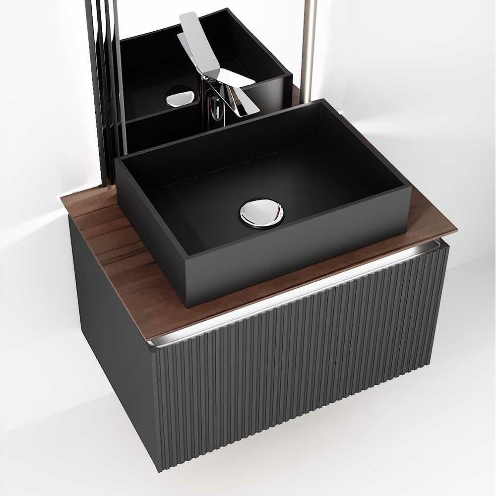 Тумба Jorno Strong 80 для накладной раковины MELANAMLN-320353MB из коллекции Strong пропитана величием римской архитектуры с ее повторяющимися колоннами и арками, монументальными опорами, отражая при этом непринужденность современной городской жизни. Натуральное дерево в сочетании с тонкими линиями краев столешницы и повторяющимися линиями на фасаде, создают баланс брутальности и утонченности.- Столешница из массива бука, уникальный рисунок каждой столешницы.Столешница из цельного массива бука, которому придали темный оттенок и влагостойкость, оснащена подсветкой. Внутри тумбы есть скрытый ящик для хранения мелочей. ВАЖНО! При выборе смесителя просьба обратить внимание на схему столешницы. Мы рекомендуем устанавливать сенсорный смеситель или смеситель с боковым открыванием. - Подсветка тумбы с сенсорным включателем - Система плавного закрывания ящиков - Внутренний дополнительный ящик для мелочей - 80000 циклов работы фурнитуры, нагрузка на ящики 25кг - Антибактериальные материалы - Корпус тумбы из МДФ в пленке ПВХФасад и боковины тумбы комплекта выполнены из МДФ , покрытого матовой пленкой графитового оттенка. Внутри и снаружи тумба выполнена в одном цвете, что создает цельность образа.- Soft Touch поверхность, мягкая бархатистая текстура и приятные тактильные ощущения