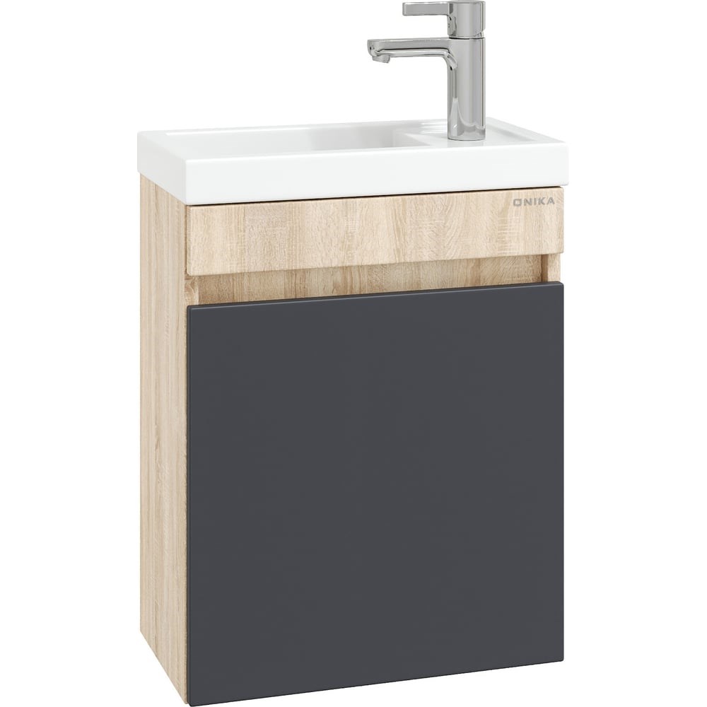 Подвесная тумба для ванной комнаты Onika Милтон 45 - идеальное решение для небольшого санузла. Тумба сочетает в себе красоту и функциональность: серый матовый фасад с покрытием SoftTouch, корпус цвета дуб сонома с роскошной текстурой, строгие формы без декора. За дверцей с интегрированной ручкой скрывается пространство с полкой для размещения необходимых бытовых принадлежностей. Корпус тумбы выполнен из ЛДСП, фасад - из ЛМДФ в пленке, специально предназначенных для использования в условиях высокой влажности. Тумба надежно крепится к стене и не занимает место на полу, не создавая при этом сложностей в уборке помещения. Подвесы для крепления тумбы - в комплекте. Размеры тумбы без учета раковины: 44х24х56см.Размеры тумбы с учетом раковины: 45х25х60 см. Гарантия на изделие 2 года. Совместимая раковина - Kirovit Фостер 45.