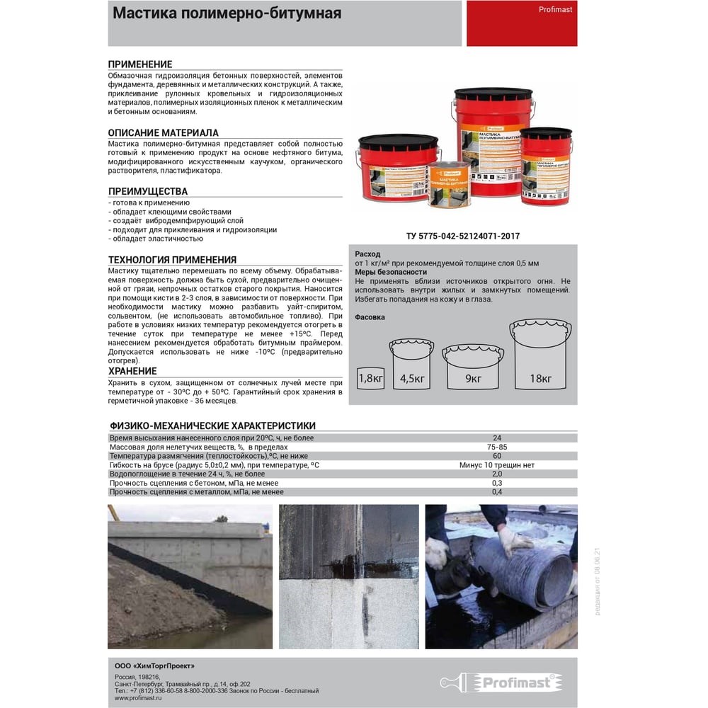 Полимерно-битумная мастика Profimast 5 л / 4,5 кг 4607952900738 обладает клеющими свойствами, что позволяет работать с рулонными кровельными и гидроизоляционными материалами, полимерными изоляционными пленками. Незаменима для гидроизоляции бетонных поверхностей, элементов фундамента, деревянных и металлических конструкций. Продукт отличается эластичностью.