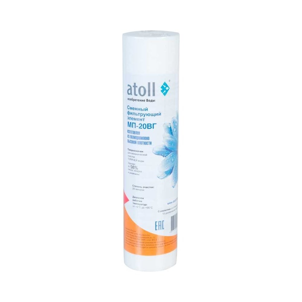 Картридж atoll МП-20ВГ SL10 изготовлен из вспененного полипропилена и предназначен для использования на первой ступени в проточных фильтрах питьевой воды, в качестве префильтра в системах обратного осмоса, а также в магистральных фильтрах холодной и горячей воды формата Slim Line 10 дюймов.Температура воды: от +4°C до +95°C.Картридж предназначен для механической очистки в локальных системах питьевой воды и в магистральных фильтрах в целях защиты сантехники и прочего оборудования от песка, ржавчины, осадка и прочих твердых примесей крупнее 20 мкм в квартирах и загородных домах.Номинальный поток: 19 л/мин.Степень очистки: 20 мкм.Рекомендуемая периодичность замены: 6 месяцев.