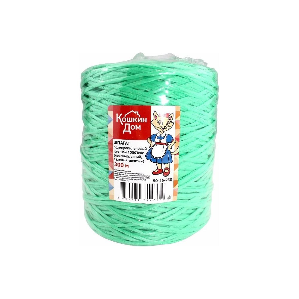 Полипропиленовый цветной шпагат КОШКИН ДОМ 1000Текс, моток 300 м красн,син.,зел.,жёлт 50-15-230 обладает повышенной прочностью и долговечностью. Полипропиленовая нить устойчива к воздействию ультрафиолета и влаге, не разбухает и не теряет форму. Шпагат безопасен в эксплуатации, может использоваться для упаковки продуктов питания.