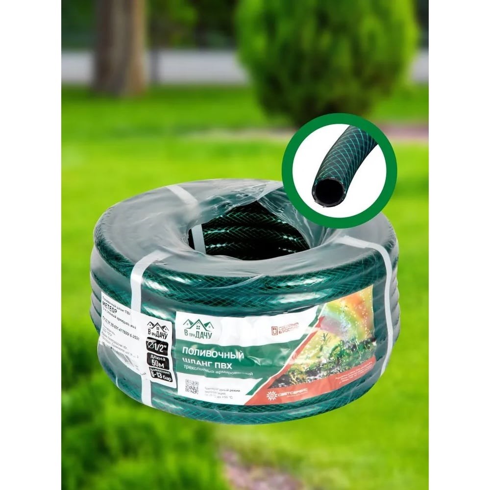 Шланг поливочный ПВХ Метеор представляет собой надежное и практичное решение для полива на приусадебном участке. Изготовленный из армированного ПВХ, он отличается прочностью и долговечностью, что позволяет ему выдерживать давление до 13 бар. Длина шланга составляет 50 метров, что обеспечивает удобство в использовании на больших территориях. Диаметр 1/2 дюйма делает его универсальным для большинства стандартных насадок и соединений. Трехслойная конструкция шланга гарантирует устойчивость к перегибам и изломам, а также защищает от воздействия внешних факторов. Может эксплуатироваться при температуре от -5 до +50 градусов Цельсия, что делает его подходящим для использования в различных климатических условиях. Зеленый цвет шланга гармонично вписывается в окружающую среду, не привлекая лишнего внимания. Армированный высокопрочной синтетической нитью шланг для полива, перекачки и прочих работ с жидкостями, в том числе с пищевыми. Внутренний слой ПВХ непрозрачный, черный, защищает от проникновения солнечных лучей и препятствует образованию водорослей внутри тела шланга. Наружный ПВХ слой прозрачный, окрашенный в зеленый цвет. При производстве используют специальные защитные добавки от воздействия внешних факторов, таких как ультрафиолетовое излучение, истирание. Между внутренним и наружным ПВХ слоями проложен высокопрочный плетеный корд из высокопрочной синтетической нити. Благодаря повышенным качественным показателям не заламывается и не перегибается.