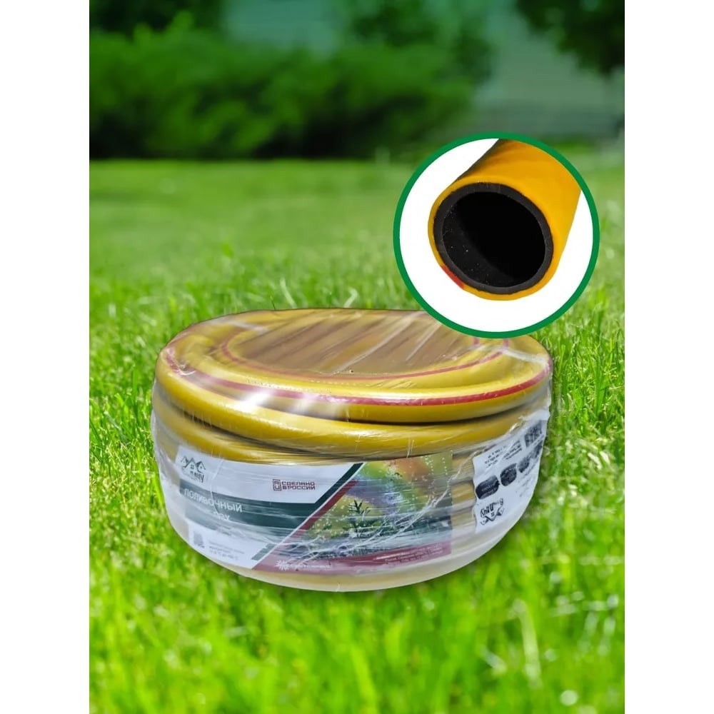 Шланг поливочный ПВХ Акварель 3-слойный армированный - это надежное решение для полива в бытовых условиях. Изготовленный из армированного ПВХ, он обладает высокой прочностью и устойчивостью к внешним воздействиям. Длина шланга составляет 25 метров, что позволяет охватить значительную площадь для полива. Диаметр 3/4 дюйма обеспечивает оптимальный поток воды, а максимальное давление в 15 бар гарантирует стабильную работу. Шланг выдерживает температуры от -5 до +40 градусов, что делает его пригодным для использования в различных климатических условиях. Желтый цвет шланга облегчает его обнаружение на участке. Этот шланг также подходит для использования с пищевыми продуктами, что расширяет его функциональность. Шланг "АКВАРЕЛЬ" - армированный высокопрочной синтетической нитью шланг для полива, перекачки и прочих работ с жидкостями, в том числе с пищевыми. Внутренний слой ПВХ непрозрачный, черный, защищает от проникновения солнечных лучей и препятствует образованию водорослей внутри тела шланга. Наружный ПВХ слой непрозрачный, окрашенный, имеет продольную цветную полосу, а так же специальные защитные добавки от воздействия внешних факторов, таких как ультрафиолетовое излучение, истирание. Между внутренним и наружным ПВХ слоями проложен высокопрочный плетеный корд из высокопрочной синтетической нити. Благодаря повышенным качественным показателям этот вид шланга имеет более высокие эксплуатационные характеристики (не заламывается и не перегибается).