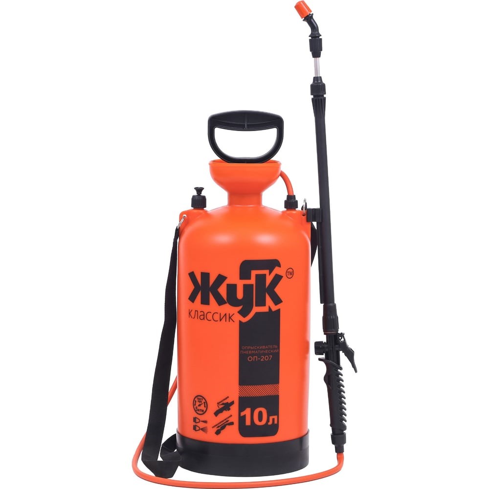 Опрыскиватель Жук Классик 10 л 4607156360451 - приспособление, используемое на садово-огородном участке или в оранжерее для полива, внесения жидких удобрений. Также может применяться для распыления чистящего средства при мытье стен, окон. Корпус опрыскивателя изготовлен из качественного пластика. Горловина бачка выполнена в виде воронки - для облегчения процесса заливки. Вместимость бака - 10 литров. Благодаря плечевым рукояткам опрыскивателем удобно пользоваться даже при обработке значительных территорий. Штанга телескопическая (ее длина регулируется от 650 до 970 мм).
