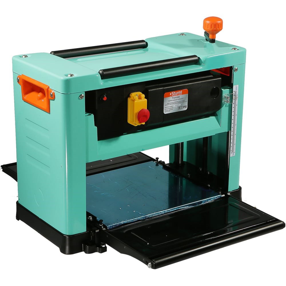 Портативный рейсмус Sturm TH20330 используется для строгания деревянных заготовок шириной до 330 мм. Рейсмус оснащен двумя удлинителями стола, оснащенными специальными роликами для облегчения подачи габаритных заготовок и их поддержки на входе и выходе. Электромагнитный выключатель обеспечивает дополнительную безопасность и исключает риск случайного включения при перебоях в электросети. Надежная ременная конструкция привода строгального барабана и цепная конструкция привода автоподачи увеличивают общий срок службы станка. Станок оснащен боковыми рукоятками для удобства переноски в рабочей зоне. Ножи из быстрорежущей стали HSS подходят для обработки пород древесины разной степени твердости.