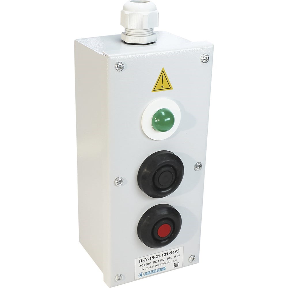 Посты управления кнопочные серии ПКУ 15-21 предназначены для коммутации электрических цепей управления переменного тока напряжением до 660В частотой 50Гц и постоянного тока до 440В. Посты представляют собой металлические оболочки со встроенными аппаратами. Посты, пристраиваемые к плоской поверхности, поставляются как с сальниками для уплотнения проводов, так и без них (оговаривается при заказе), а подвесные посты - только с сальниками. В постах могут быть 1 или 2 сальниковых ввода. Сальниковый ввод типа PG16; PG19; PG21; PG29; PG32 (по техническому заданию) Пост управления в металлическом корпусе, комплектуются коммутационными аппаратами ВК, КЕ, ПЕ, светосигнальной арматурой СКЛ, АЕ с оперативными табличками, с установочным отверстием диаметром 30мм. В постах со степенью защиты IР54 между корпусом и панелью в местах установки аппарата дополнительно установлены герметизирующие прокладки и гермошайбы.