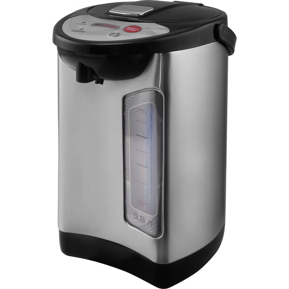 Поттер Willmark WAP-403IS 2001237 сочетает в себе функции электрочайника и термоса. Чайник-термос снабжён поворотным механизмом. Гарантийный срок эксплуатации прибора 2 года. На модели установлен нижний нагревательный элемент мощностью 900 Ватт, который увеличит срок службы термопота. Температура кипячения 100 градусов Цельсия, температура поддержания температуры 85 градусов Цельсия. Внешний корпус выполнен из чёрного пластика и нержавеющей стали. На передней панели установлена стильная шкала с минимальными и максимальными обозначениями уровня воды в приборе. Ёмкость для нагрева воды из нержавеющей стали объемом 3,8 литра. Имеется 2 способа налива воды: электрический насос (кнопка на панели), электронный насос (кнопка под носиком).