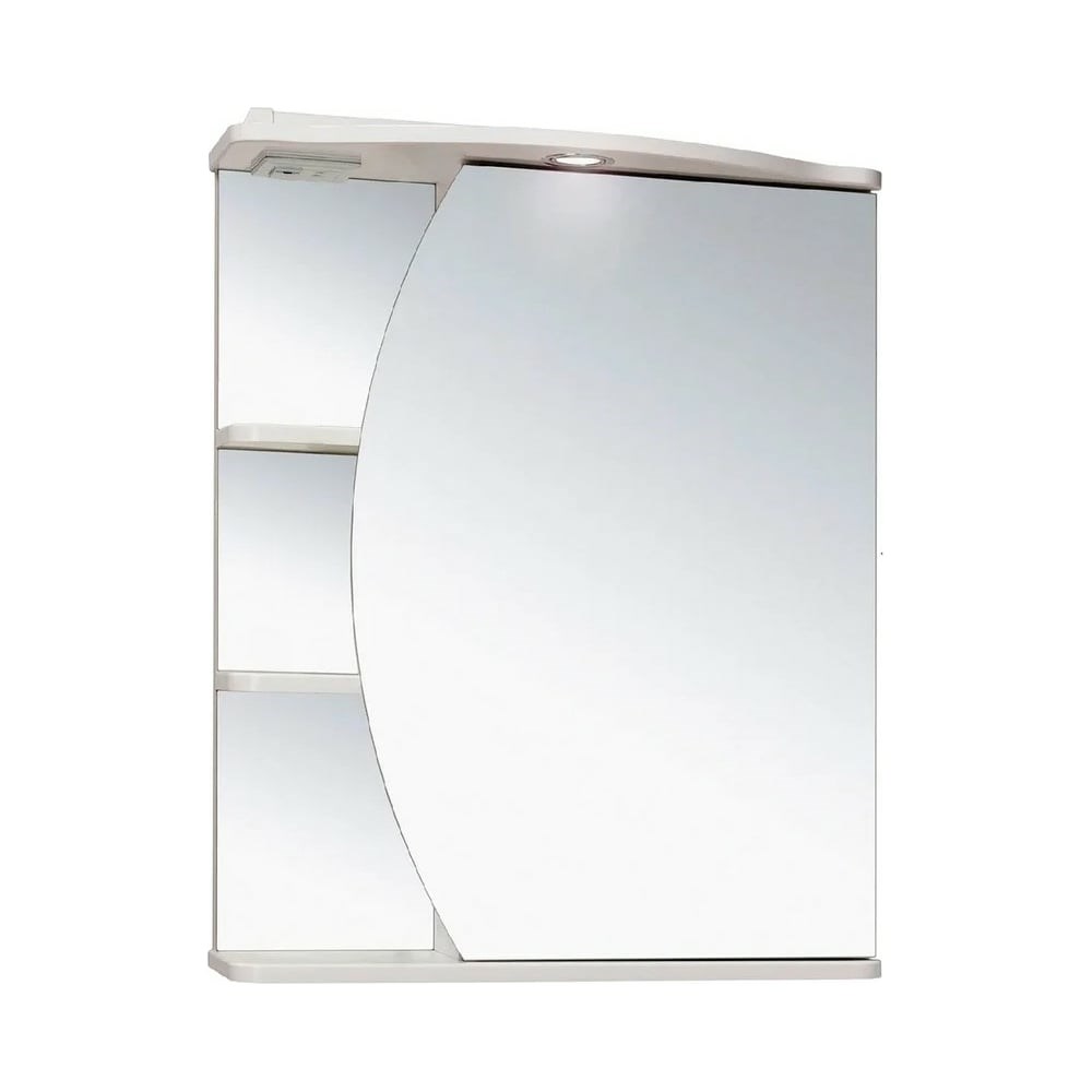 Зеркальный шкаф RUNO Линда 60 правый 00000001082 имеет одну распашную фигурную дверцу с зеркальным фасадом справа, две открытые полки слева. Шкаф для ванной оборудован одним врезным светодиодным светильником 220 В, розеткой с выключателем, петлями со встроенным доводчиком.