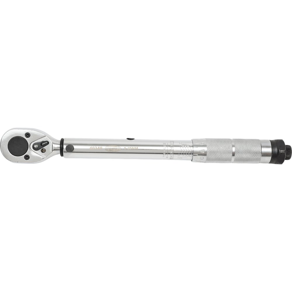 Динамометрический предельный ключ 3/8 5-25 Нм,L=280mm АвтоDело 40349 14881 обладает удобной рифленой рукояткой, которая не скользит в ладонях. Трещотка с реверсом позволяет эффективно работать с левой и правой резьбой.