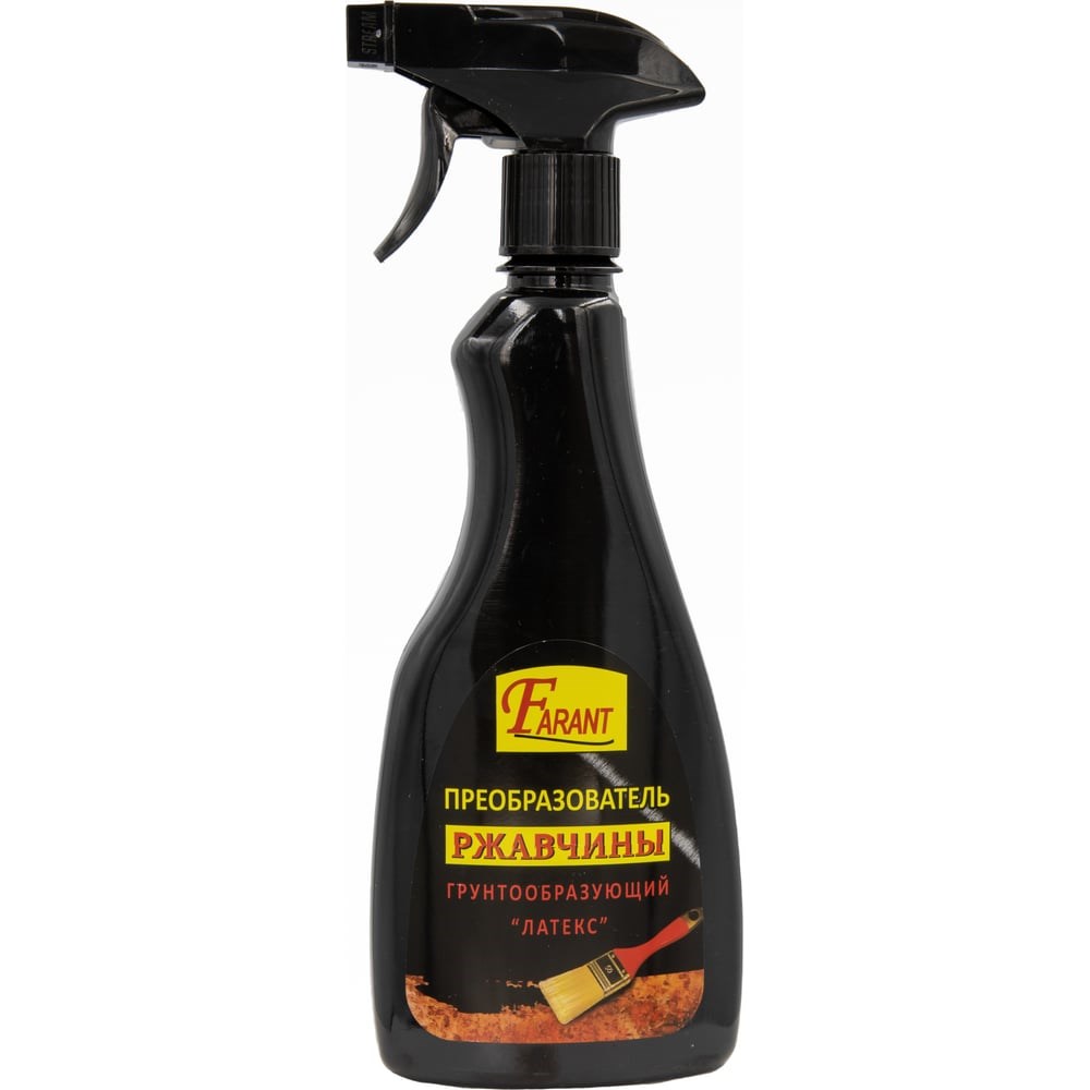 Эффективное и экономичное средство для быстрой подготовки ржавых металлических поверхностей к покраске. Значительно продлевает срок службы ЛКП, если приходится красить прямо по ржавчине. Преобразователь ржавчины грунтообразующий «Farant» предназначен для подготовки значительно поржавевших металлических поверхностей к покраске любыми типами ЛКМ. Преобразует продукты коррозии в грунт. Останавливает процессы коррозионного разрушения. Образует на поверхности полимерное покрытие, улучшающее адгезию. Способ применения: очистить рыхлую ржавчину. Взболтать, нанести распылителем, кистью или валиком на сухую поверхность. Расход около 1л на 6м2при толщине ржавчины 30-150мкм. Смывать не нужно. После высыхания окрасить. Наносить при температуре от +10 до +30 С. Так же преобразователь «Farant» позволяет очистить металл, если ржавчина незначительная, или металл с пятнами. Необходимо наносить преобразователь, периодически протирая поверхность, после высыхания смыть продукты реакции обезжиривателем и сразу покрасить. Важно! Температура хранения от 0 до +30.