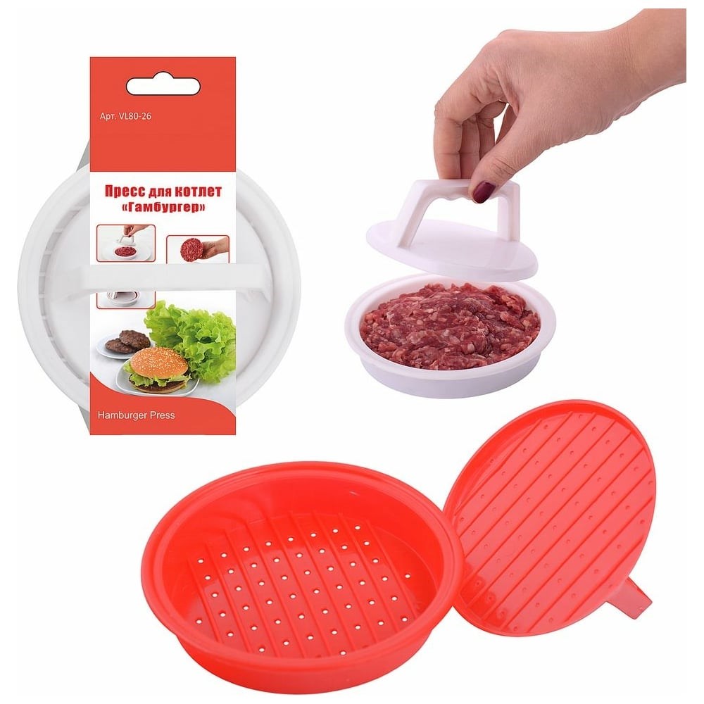 Пресс для котлет МУЛЬТИДОМ Гамбургер красный VL80-26С формирует ровные и красивые котлеты из любого фарша: говядина, рыба, курица. Выполнен из полипропилена, поэтому легко моется. Способ применения: небольшое количество фарша поместите в нижнюю часть пресса, равномерно распределите и плотно придавите крышкой. Уберите крышку и переложите полученную котлету на раскаленную сковороду или прокладывайте получаемые котлеты бумагой для выпекания, если хотите приготовить их позже. После использования промойте пресс под проточной водой, можно с использованием жидких моющих средств.