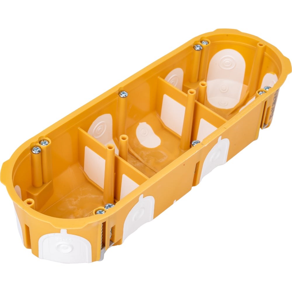 Конструкция коробки двухкомпонентного литья, не содержащая галогенов, предназначена для использования в помещениях с полыми стенками, где требуется повышенная защита людей и имущества. Ввод кабеля осуществляется путем прорыва входного отверстия на гибких мембранах и протягивания кабеля в отверстие. Коробка соответствует требованиям для установки в звуконепроницаемых стенах с уровнем шума до 69 дБ.Дополнительная информация:Для многоместных рамок.Повышенная прочность упрощает установку приборов.Входные отверстия изготовлены из эластичного материала.Обеспечивает герметичность ввода кабеля или трубы.Предотвращает прохождению воздуха через проводку.Рекомендуется для энергосберегающих или пассивных домов.На внешней стороне три шипа для пометки центра сверления.Коробка снабжена пластмассовыми крепежными лапками.Монтажные и приборные винты имеют трехшаговую резьбу для быстрой установки.Ввод кабеля осуществляется путем прорыва мембраны острым предметом (например, отверткой); при необходимости мембранный вход можно удалить.Защищено европейским промышленным патентом.Степень защиты IP30 достигается установкой устройств с равной или более высокой степенью защиты IP30.При монтаже нет необходимости углублять край гипсокартон
