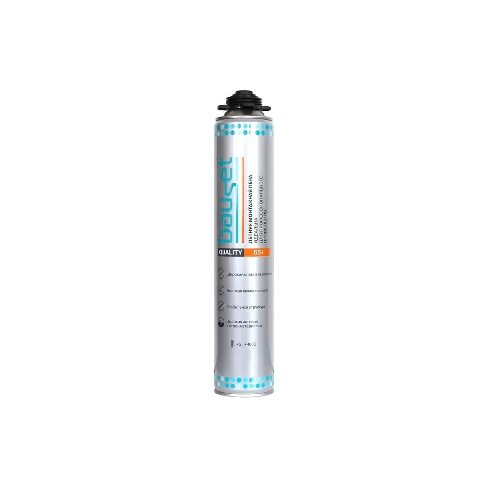 Профессиональная монтажная пена BAUSET 65+ quality летняя BAU1017/MP - это однокомпонентная профессиональная монтажная пена, застывающая под воздействием влаги воздуха, применяется для герметизации и изоляции в строительстве. Наносится с помощью пистолета. Продукт имеет отличную адгезию к кирпичу, штукатурке, металлу, цементу, дереву, полистиролу, профилям ПВХ, стеклу, застывшим полиуретанам и т.д. Обладает хорошими звукопоглащающими и термоизоляционными свойствами. Внимание! Выход пены до 65 литров (в зависимости от температуры и влажности воздуха).
