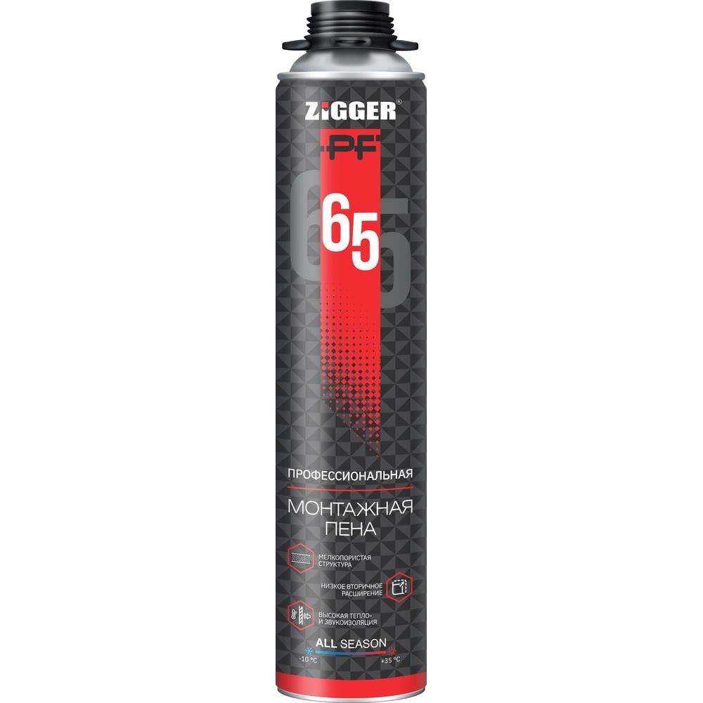 Пена монтажная профессиональная всесезонная ZIGGER PF 65 – высококачественная однокомпонентная полиуретановая пена, предназначенная для монтажа окон, дверей, подоконников, стеновых панелей и других элементов при выполнении строительных и отделочных работ, а также для герметизации, тепло – и звукоизоляции швов, щелей, пустот.ПОДГОТОВИТЕЛЬНЫЕ РАБОТЫ: Поверхности, на которые наносится пена, очистить от грязи, пыли и жира. Для получения наилучшего результата до нанесения монтажной пены рабочие поверхности увлажнить, если температура окружающей среды не ниже 0 °C. Не наносить на поверхность, покрытую льдом или инеем. С целью аккуратного выполнения работ, прилегающие поверхности закрыть пленкой.