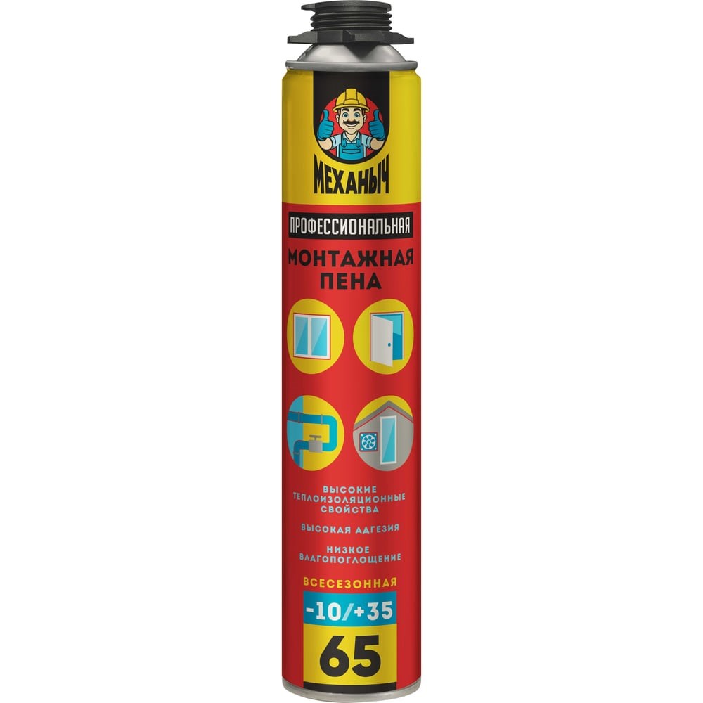 Пена монтажная МЕХАНЫЧ 65 – профессиональная универсальная однокомпонентная полиуретановая пена, предназначенная для работы в диапазоне температур от -16°С до +35°С. Наилучшие результаты достигаются при применении пены при температуре не ниже -12°С. Свойства: · Затвердевает в диапазоне от -16 °С до +35 °С; · Обладает высокими тепло- и звукоизоляционными свойствами; · Обладает отличной адгезией к бетону, гипсу, кирпичу, напольным панелям, стеклу, дереву, ПВХ (кроме фторопласта, полиэтилена и полипропилена); · Отличается низким влагопоглощением; · Образование поверхностной пленки: 15 мин. (при температуре +20 °С, отн. влажности 65 %); · Время предварительной обработки: 80 мин. (при температуре +20 °С, отн. влажности 65 %); · Содержит замедлитель горения; · Не содержит веществ опасных для озоносферы; · В состав формулы включены вещества растительного происхождения; · Пена обладает низким показателем вторичного расширения, в условиях пониженной влажности окружающего воздуха (ниже 50%) требует обязательного увлажнения при нанесении. Сфера применения: · Монтаж дверных и оконных рам из ПВХ и других материалов; · Заделка и теплоизоляция сетей водопровода, канализации и центрального отопления; · Звукоизоляция и герметизация строительных перегородок, кабин автомобилей и катеров; · Соединение и герметизация готовых сборных деревянных элементов в каркасном строительстве; · Теплоизоляция крыш и совмещенных перекрытий.
