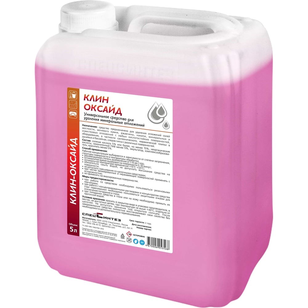 Клин-Оксайд предназначен для удаления водяного и мочевого камня, ржавчины, накипи, минеральных и известковых отложений с любых кислотостойких поверхностей, оборудования, сантехнического, керамической плитки, в душевых и бассейнах; следов гипса с различных поверхностей.Область применения: гостиницы, бизнес-центры, спортивные и культурные центры; вокзалы, аэропорты; предприятия общественного питания, предприятия пищевой и перерабатывающей промышленности, лечебно-профилактические учреждения, зубопротезные лаборатории, гипсовые манипуляционные, детские и учебные учреждения, объекты ЖКХ.Рекомендации: рекомендуемая степень разбавления от 1:10 до 1:100. Нанести раствор на поверхность, выдержать, смыть водой; оптимальное время выдержки 5-10 минут; температура применения +15°C – +25°C; обязательно смыть водой; не допускать высыхания средства на поверхности; не допускать смешивания со щелочными средствами.Меры предосторожности: необходимо пользоваться резиновыми перчатками; при переливании концентрата пользоваться защитными очками; при попадании средства в глаза или на кожу промыть проточной водой.Хранить в закрытом виде отдельно от щелочных средств, в местах недоступных детям, t не выше +40°С; не допускать хранения под открытым солнцем.