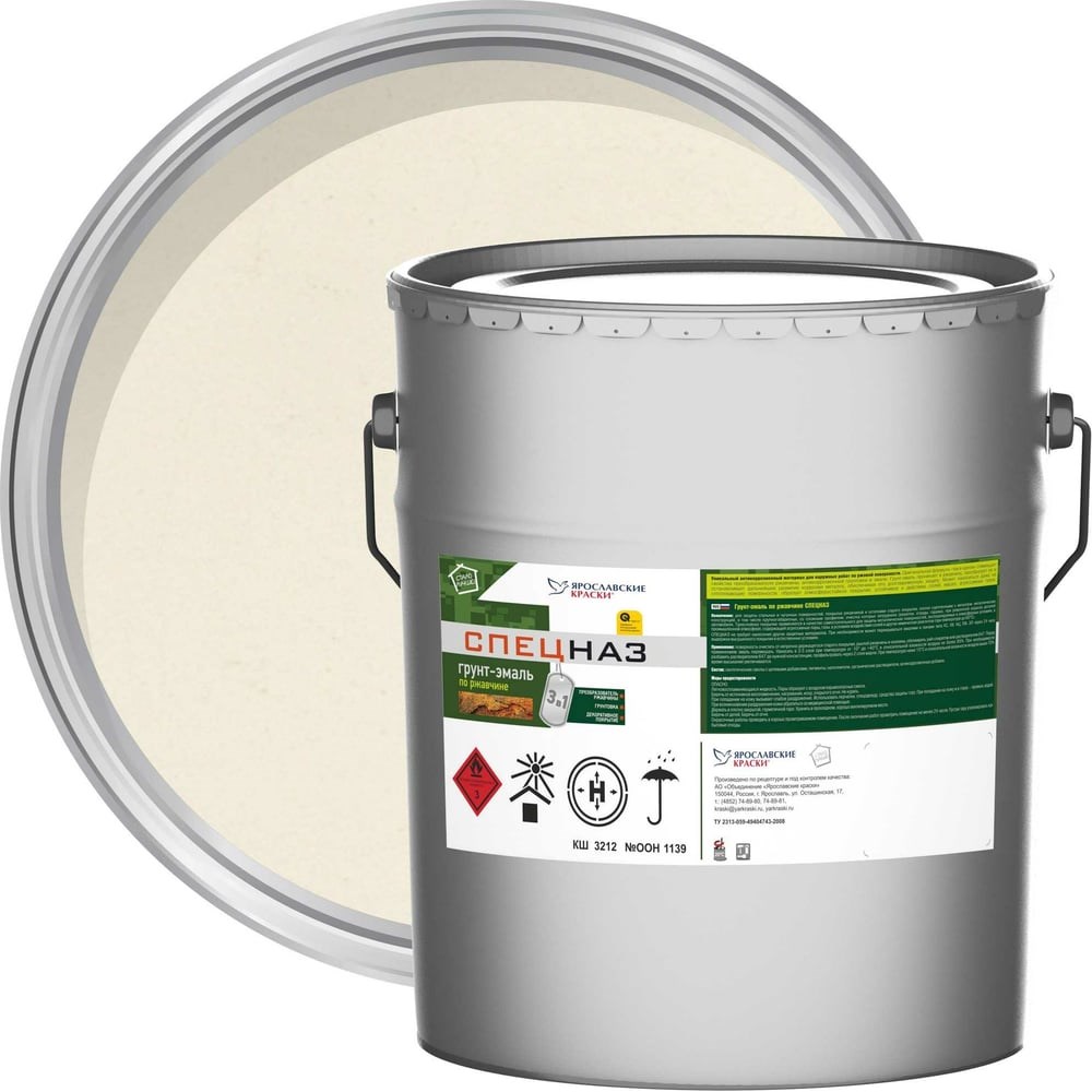 Грунт-эмаль по ржавчине ЯРОСЛАВСКИЕ КРАСКИ СПЕЦНАЗ белый, RAL 9003, ведро 20 кг 209223 применяется для защиты стальных и чугунных поверхностей, покрытых ржавчиной и остатками старого покрытия, плотно сцепленными с металлом: металлических конструкций, в том числе крупногабаритных, со сложным профилем, очистка которых затруднена (решетки, ограды, гаражи), при ремонтной окраске деталей автомобиля (крылья, днища и т. д.) Трехслойное покрытие применяется в качестве самостоятельного для защиты металлических поверхностей, эксплуатируемых в атмосферных условиях, в промышленной атмосфере, содержащей агрессивные пары, газы, в условиях воздействия солей и других химических реагентов (при температуре до +60ºС).