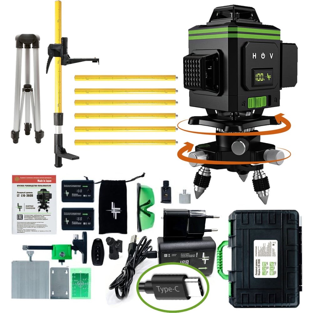 Профессиональный лазерный уровень LT L16-360B + штатив с треногой 4.8 м L16-360B/4.8м+ выстраивает 4 плоскости в 360 градусов (в круговую): 2 вертикальные плоскости с пересечением под прямым углом и 2 горизонтальные линии снизу и сверху уровня. Работает от Li-ion батареи 6000 мАч с зарядным устройством. Особенности: до 8 часов работы при постоянном свечение луча лучи включаются как с сенсорных кнопок на корпусе устройства, так и с пульта дистанционного управления зеленый цвет луча лучше виден на свету и менее вреден для глаз противоударный и влагозащитный кейс для переноски устройства Модель проходит трехступенчатый контроль проверки качества сборки на заводе-производителе и инспекционный контроль приемки товара.