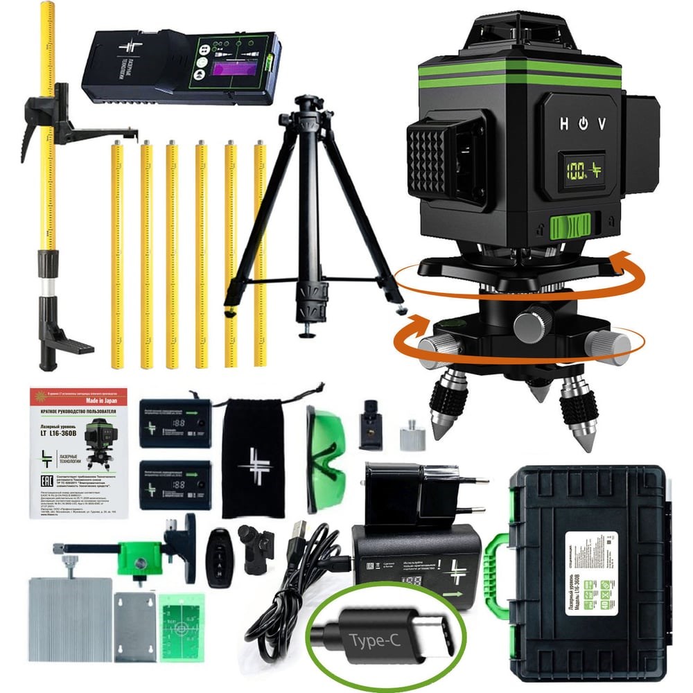 Профессиональный лазерный уровень LT L16-360B + штатив 4.8 м + тренога 1.5 м усиленная + приемник (отражатель) лазерного луча L16-360B/4.8м/1.5м-УС/ОТР выстраивает 4 плоскости в 360 градусов (в круговую): 2 вертикальные плоскости с пересечением под прямым углом и 2 горизонтальные линии снизу и сверху уровня. Работает от Li-ion батареи 6000 мАч с зарядным устройством. Особенности: до 8 часов работы при постоянном свечение луча; лучи включаются как с сенсорных кнопок на корпусе устройства, так и с пульта дистанционного управления; зеленый цвет луча лучше виден на свету и менее вреден для глаз; противоударный и влагозащитный кейс для переноски устройства. Модель проходит трехступенчатый контроль проверки качества сборки на заводе-производителе и инспекционный контроль приемки товара.