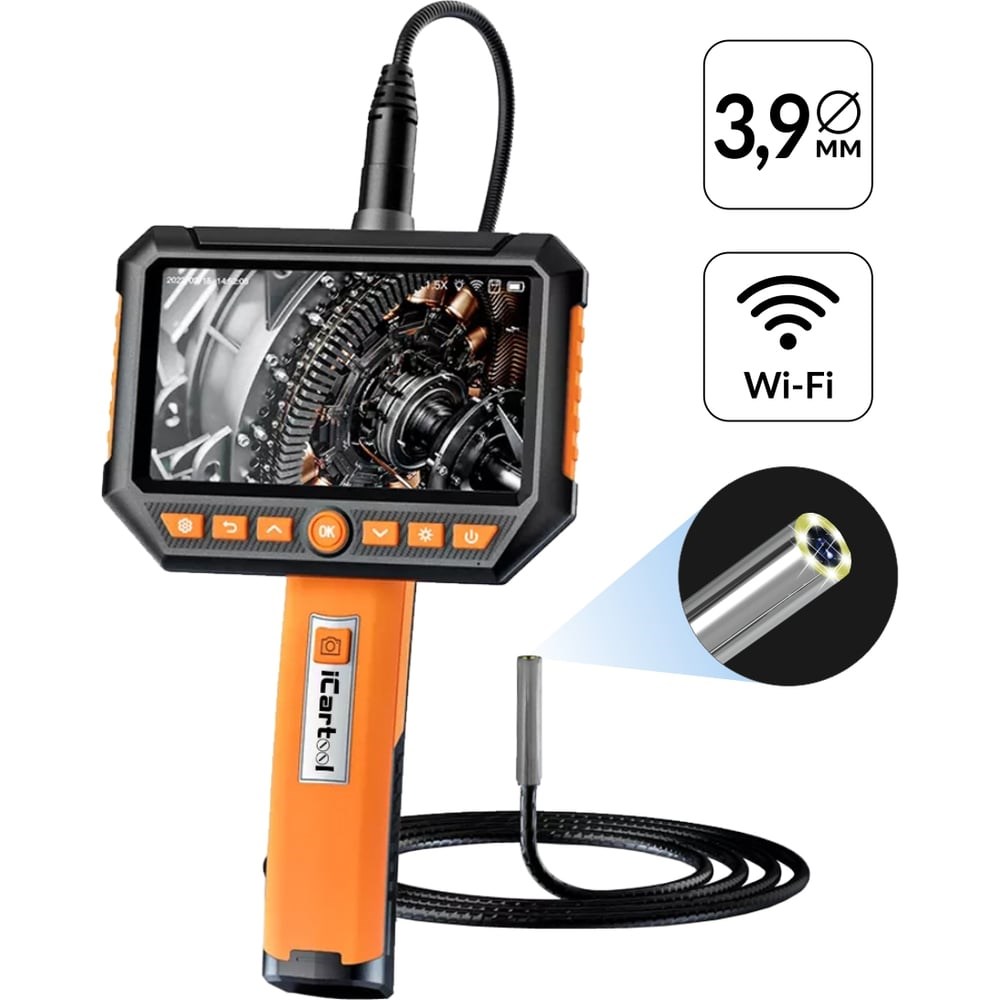 Промышленный видеоэндоскоп iCartool IC-V116C оснащен большим информативным дисплеем, модулем Wi-Fi, микрофоном и съемным зондом 3.9 мм.Экран с диагональю 5” и матрицей IPS имеет удобный интерфейс и воспроизводит изображения в отличном качестве с разрешением HD.Зонд эндоскопа полужесткий, с эффектом памяти формы, имеет длину 1 м. Предусмотрена возможность подбора и замены зонда для различных задач.Видеоэндоскоп позволяет производить аудиозапись и транслировать процесс съемки на устройства с ОС iOS/Android посредством Wi-Fi соединения. Регулируемая LED подсветка обеспечивает возможность детального осмотра объекта. Встроенный аккумулятор поддерживает работу до 5 часов без подзарядки.Особенности видеоэндоскопа IC-V116CЦветной IPS экран 5” с разрешением HD (1280х720)Разрешение фото и видео Full HD (1920х1080)Длина зонда 1 мЗонд съемный, имеет оплетку из износостойкого полиуретанаLED подсветка из 6 светодиодов с 3 режимами яркостиВстроенный Wi-Fi модуль для одновременной демонстрации процесса съемки на мобильное устройствоВстроенный микрофон и динамикДополнительный яркий фонарик с настройкой угла освещенияДля сохранения полученных результатов используется внутренняя память объемом 2,4 ГБПоддержка карт памяти до 64 ГБСобственный литий-ионный аккумулятор емкостью 4400 мАч