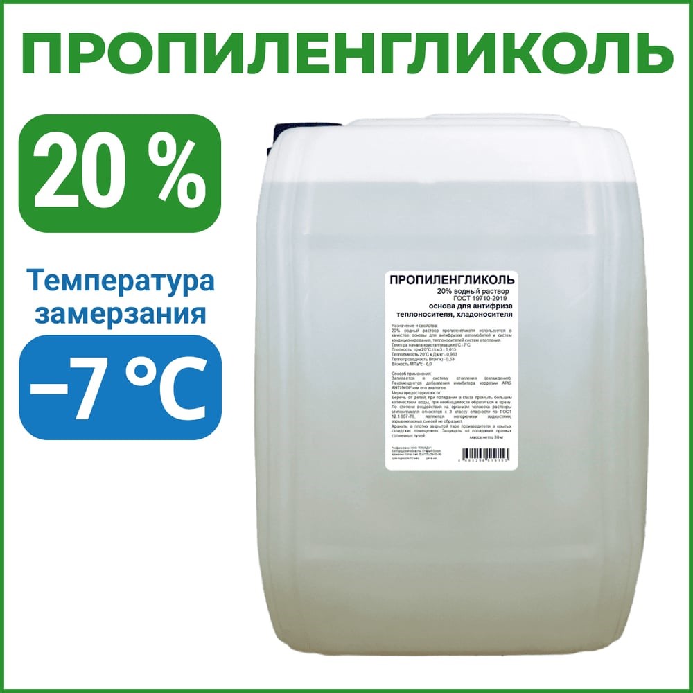 20-процентный водный раствор пропиленгликоля используется в качестве экологичной основы антифризов для автомобилей и систем кондиционирования, а также основы теплоносителей для систем отопления бытового и промышленного назначения. Обеспечивает стабильную работу теплообменного оборудования в диапазоне температур от от −7 °C до +108 °C. Пропиленгликоль безопасен для здоровья человека, не образует ядовитых соединений и легко утилизируется по окончанию срока эксплуатации. Плотность при 20 ℃ - 1.015 г/см3 Теплоемкость при 20 ℃ - 0.963 кДж/кг Теплопроводность — 0.53 Вт/м·К Вязкость — 7 МПа∙с