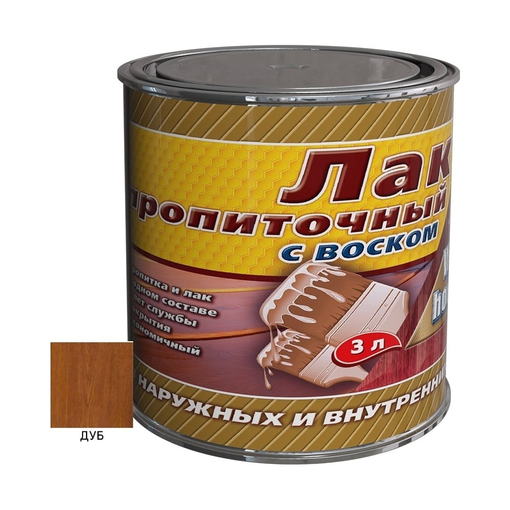 Пропиточный лак с воском White House (дуб; 3 л) 15461 Пропиточный лак для дерева с воском WHITE HOUSE для внутренних и наружных работ. Алкидный лак быстросохнущий и экономичный, образует финишное покрытие со сроком службы - 8 лет. Лак предназначен для защитно-декоративной отделки поверхностей из всех видов древесины, эксплуатируемых внутри и снаружи помещений. Рекомендуется для окраски оконных блоков, дверей, лестниц, плинтусов, мебели, деревянных фасадов, заборов, садовых строений и т.п. Лак противогрибковый отлично пропитывает и защищает древесину от биологических повреждений (синевы, плесени, гнили, грибка), отпугивает деревопоражающих насекомых, продлевает срок службы деревянных изделий в суровых погодных условиях. Не требует предварительного применения специальных антисептиков. Лак прозрачный позволяет длительно сохранять натуральный вид древесины, цветные имитируют ценные породы дерева, не закрашивая его текстуру за два слоя. Все цвета смешиваются между собой. После высыхания образует эластичное глянцевое покрытие. Двойной УФ-фильтр надежно защищает поверхность от выцветания, а натуральный карнаубский воск и льняное масло защищает поверхность от воздействия влаги. Применяйте пропиточный лак с воском в качестве грунтовки , лака для стен и мебели , лака для дверей , окон, заборов и фасадов. Лак глянцевый для дерева готов к применению и не требует разбавления. Перед применением и во время использования лак необходимо перемешивать.