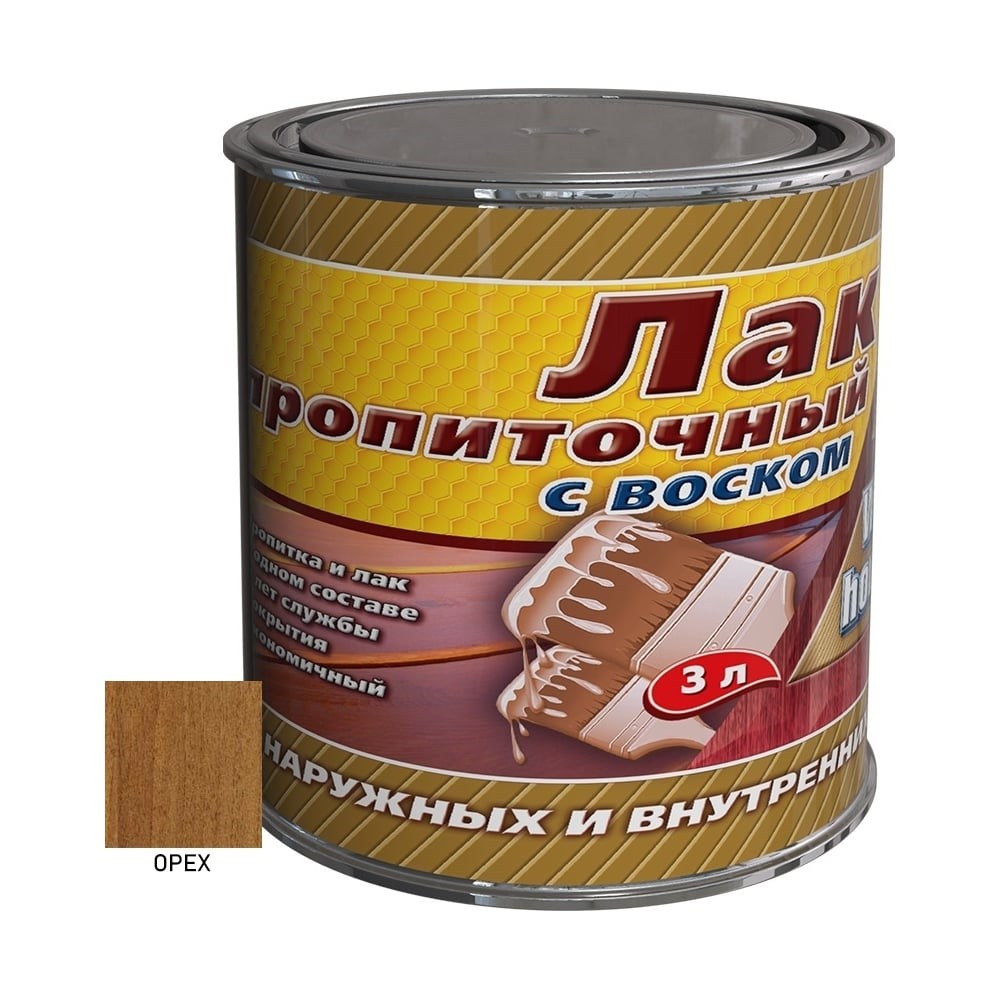 Пропиточный лак с воском White House (орех; 3 л) 15469Пропиточный лак для дерева с воском WHITE HOUSE для внутренних и наружных работ. Алкидный лак быстросохнущий и экономичный, образует финишное покрытие со сроком службы - 8 лет. Лак предназначен для защитно-декоративной отделки поверхностей из всех видов древесины, эксплуатируемых внутри и снаружи помещений. Рекомендуется для окраски оконных блоков, дверей, лестниц, плинтусов, мебели, деревянных фасадов, заборов, садовых строений и т.п. Лак противогрибковый отлично пропитывает и защищает древесину от биологических повреждений (синевы, плесени, гнили, грибка), отпугивает деревопоражающих насекомых, продлевает срок службы деревянных изделий в суровых погодных условиях. Не требует предварительного применения специальных антисептиков. Лак прозрачный позволяет длительно сохранять натуральный вид древесины, цветные имитируют ценные породы дерева, не закрашивая его текстуру за два слоя. Все цвета смешиваются между собой. После высыхания образует эластичное глянцевое покрытие. Двойной УФ-фильтр надежно защищает поверхность от выцветания, а натуральный карнаубский воск и льняное масло защищает поверхность от воздействия влаги. Применяйте пропиточный лак с воском в качестве грунтовки , лака для стен и мебели , лака для дверей , окон, заборов и фасадов. Лак полуматовый для дерева готов к применению и не требует разбавления. Перед применением и во время использования лак необходимо перемешивать.