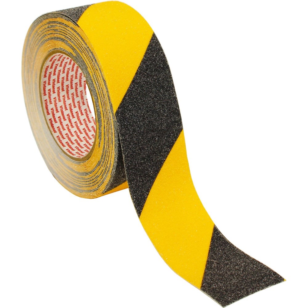 Противоскользящая лента Vintanet AS60, средней зернистости, черно-желтая, 50мм х 10м AS605010BY имеет специальный зернистый слой для предотвращения скольжения в местах с повышенным риском, которые становятся скользкими под воздействием влаги, снега и мороза. Лента предназначена для нанесения на грубые поверхности: на камень, бетонные поверхности, металл, дерево и др. Обеспечивает максимальную эффективность для маркировки различных ступеней, подиумов, пандусов. Может использоваться как внутри, так и снаружи помещений.