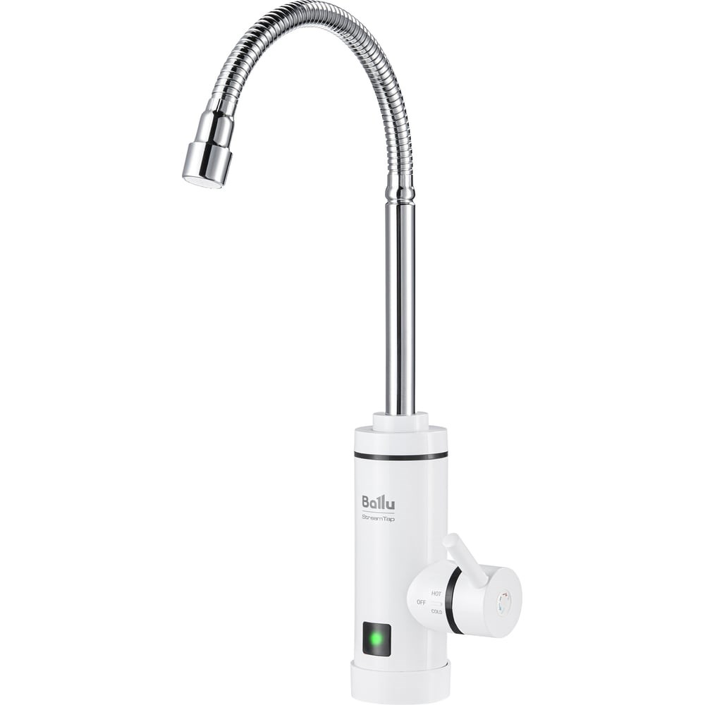 Ballu StreamTapЭлектрический проточный водонагреватель StreamTap обеспечит мгновенный нагрев воды в квартире, на даче или офисе в течение всего года, исключая зависимость от сезонно-профилактических и ремонтных работ систем теплоснабжения. Компактная модель предназначена для установки вместо обычного смесителя. Прибор прост в монтаже. Чтобы воспользоваться горячей водой уже в день покупки прибора, достаточно заменить привычный кран на водонагреватель и подключить его к розетке. Гибкий шланг-излив Гибкий шланг-излив решает сразу несколько актуальных задач. Он позволяет регулировать высоту подачи воды, дает возможность направлять струю воды в любое нужно место, с ним легко и удобно ополоснуть фрукты, овощи, раковину и наполнить водой любую емкость. Такой кран оптимально подходит для установки на двойную мойку, делая эксплуатацию наиболее комфортной. Мгновенный нагрев Производительность нагревательного элемента составляет 3,3 кВт. Это дает возможность мгновенно нагревать до 1,5 л воды в минуту. Такого объема достаточно для мытья рук, посуды. Индикация нагрева Индикация на корпусе прибора проинформирует о состоянии прибора. При включении нагревательного элемента на корпусе прибора загорается индикатор, информирующий о начале процесса нагрева воды. При отключении нагрева индикатор гаснет.