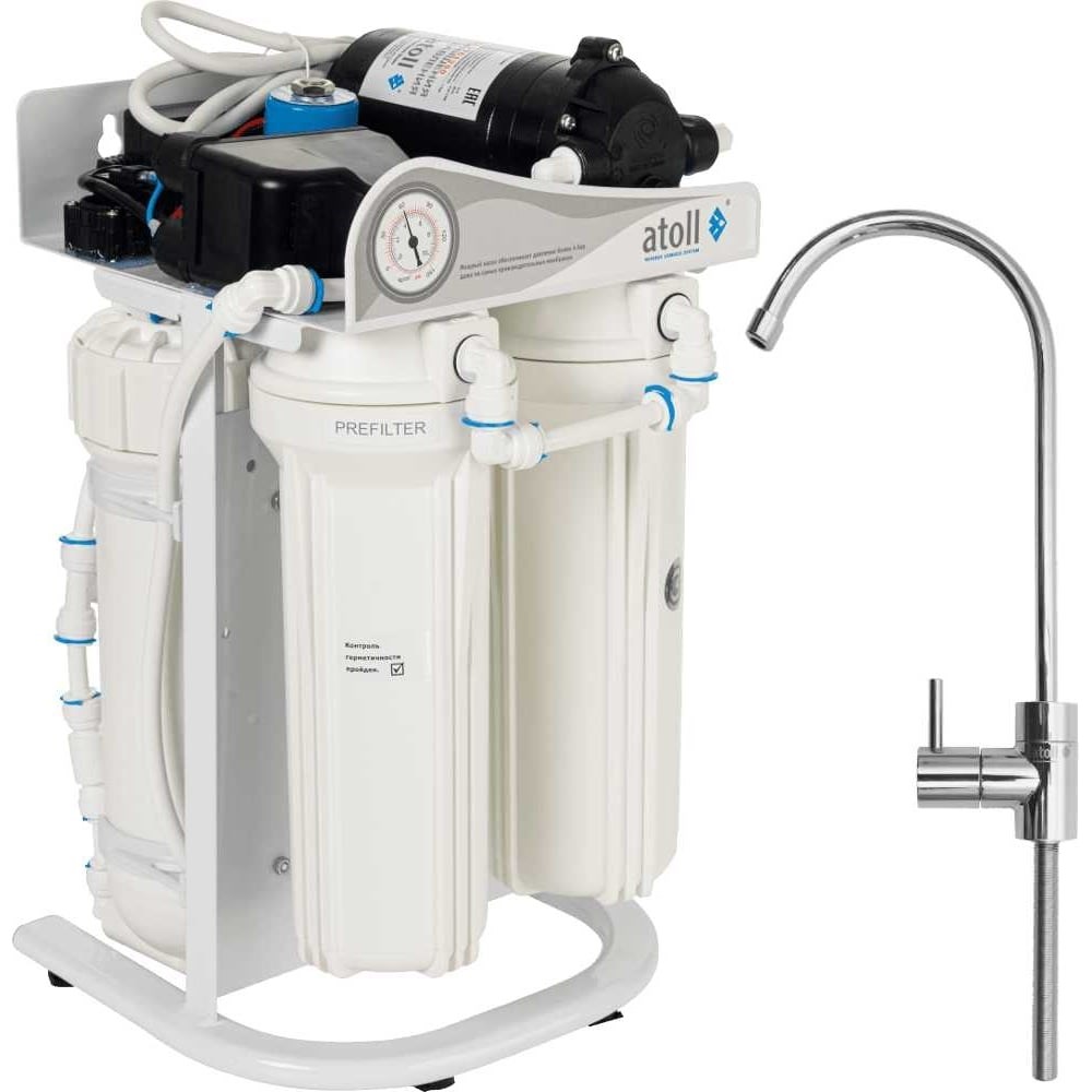 Прямоточная система обратного осмоса аtoll A-3800p STDA предназначена для очистки питьевой воды в бытовых и коммерческих целях.В состав системы A-3800p STDA входят элементы:Префильтр механической очистки atoll WP-5 из полипропиленового шнура — удаляет механические частицы размером более 5 мкм (песок, взвеси, ржавчину).Угольный префильтр atoll GAC-10 с гранулированным активированным углём — удаляет хлор и органические соединения.Две высокопроизводительные обратноосмотические мембраны atoll TW30-3012-500HR.Мощный насос повышения давления — обеспечивает высокую производительность мембран и фильтра в целом.Редукционный клапан — защищает систему от повышенного давления водопроводной воды.Кран для питьевой воды — врезается в кухонную мойку или столешницу.Накопительный бак приобретается отдельно при необходимости. Размер бака определяется необходимым запасом чистой воды. Для использования установки в домашних условиях накопительный бак не требуется.Производительность системы — 1,5-2 л/мин.