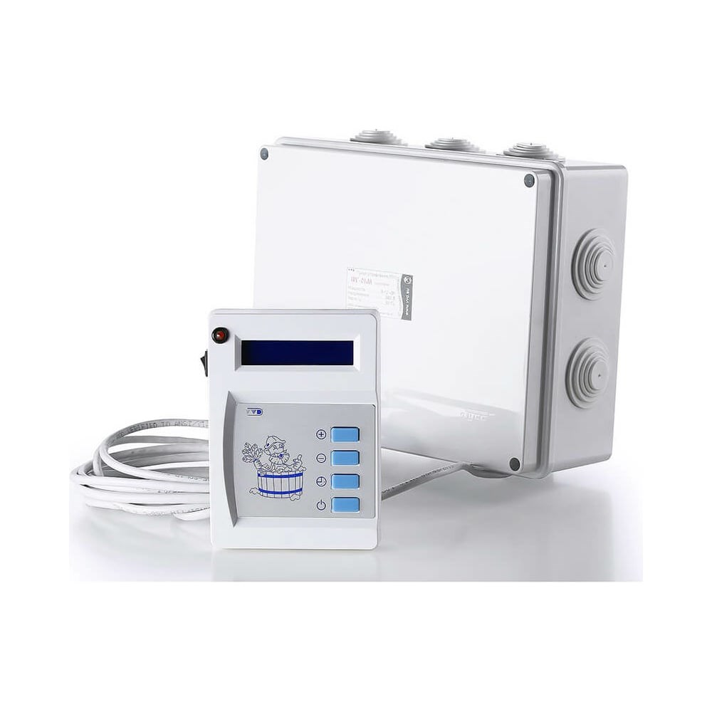 Пульт управления для электрокаменки VVD ПУ-01 МП 2,25-6,25/220 электронный блок ПУ, силовой блок ПУ 260x210x100мм 7645 предназначен для безопасного подключения электрических печей мощностями от 2,25 до 6,25 кВт, напряжением 220В и управления их работой в автоматическом режиме. Электронный терморегулятор позволяет поддерживать заданную температуру, снабжен информационным табло и включать встроенный электрический генератор перегретого пара. Внимание! Внешний вид товара может отличатся от фото.
