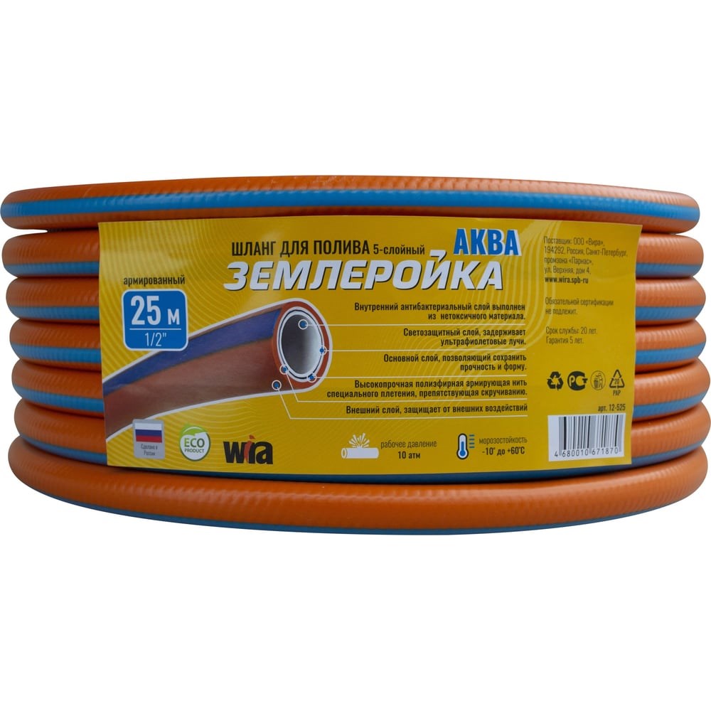 Шланг 5-ти слойный Землеройка Аква 1/2", 25 м 12-525 предназначен для подачи воды к месту полива. Внутренний антибактериальный слой выполнен из нетоксичного материала. Светозащитный слой задерживает ультрафиолетовые лучи. Основной слой, позволяющий сохранить прочность и форму. Высокопрочная полиэфирная армирующая нить специального плетения, препятствующая скручиванию. Внешний слой защищает от внешних воздействий. Морозостойкость от -10°С до +60°С.