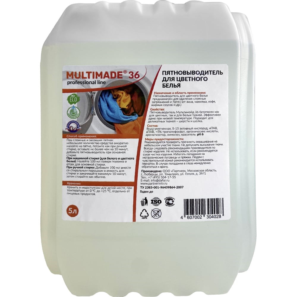 Пятновыводитель для цветного белья Мультимэйд 36 предназначен для удаления сложных загрязнений и пятен от вина, макияжа, кофе, жирных соусов и др. Безопасен как для цветных, так и для белых тканей.Перед использованием рекомендуется проверить прочность окрашивания на небольшом участке ткани.Способ примененияПри сложных и засохших пятнах небольшое количество средства аккуратно налейте на пятно, потрите, как при ручной стирке, оставьте не более чем на 10 минут. Затем добавьте пятновыводитель при основной стирке.При машинной стирке (для белого и цветного белья): налейте 100 мл поверх порожка в отсек для основной стирки.При ручной стирке: добавьте 100 мл вместе со стиральным порошком в емкость для стирки и замачивайте минимум 10 минут, затем стирайте, как обычно.