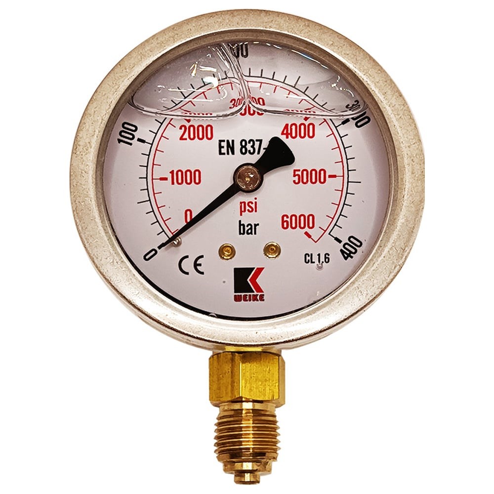 Манометр гидравлический деформационный с трубчатой пружиной, заполненный глицерином. Его тип радиальный – выход штуцера расположен перпендикулярно центральной оси манометра. У представленного манометра 2 шкалы измерения в Бар (bar / черная шкала) и Пси (psi / красная шкала). Класс точности: 1,6 Ключ штуцера: 14 х 14 мм Заполнение корпуса: глицерин 99,7% Степень защиты: IP65 Манометр является виброустойчивым и применяется при соответствующих внешних факторах, для измерения давления газообразных и жидких, несильно вязких и не кристаллизирующихся сред, не агрессивных к деталям из медных сплавов. Эти виброустойчивые глицеринозаполненные манометры широко используются в насосном и компрессорном оборудовании, применяются в машиностроении, нефтехимической, пищевой, фармацевтической промышленности.