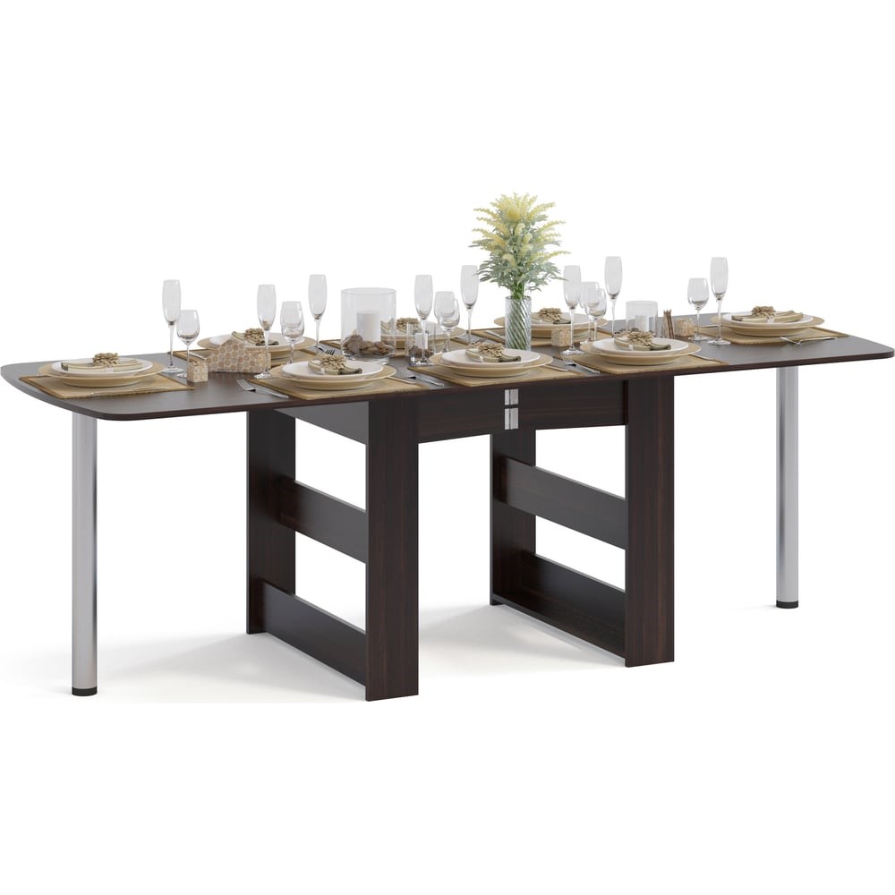 Раскладной стол СОКОЛ венге СП-11.1 СП11.1В5 для любителей устраивать пышные застолья. Уникальность стола заключается в том, что он имеет три варианта размера: Сложенный стол – размер 740 Х 314 Х 830 мм – может использоваться как пристенный столик; На половину разложенный стол – размер 740 Х 1680 Х 830 мм – подойдет для небольшого праздничного обеда; Полностью разложенный стол – размер 740 Х 2255 Х 830 мм – подойдет для масштабного застолья. Благодаря металлическим ножкам и устойчивым центральным опорам из ЛДСП, даже в максимально разложенном виде конструкция стола остается устойчивой, а для более легкого раздвижения стола предусмотрены колесики. Толщина столешницы составляет 16 мм.