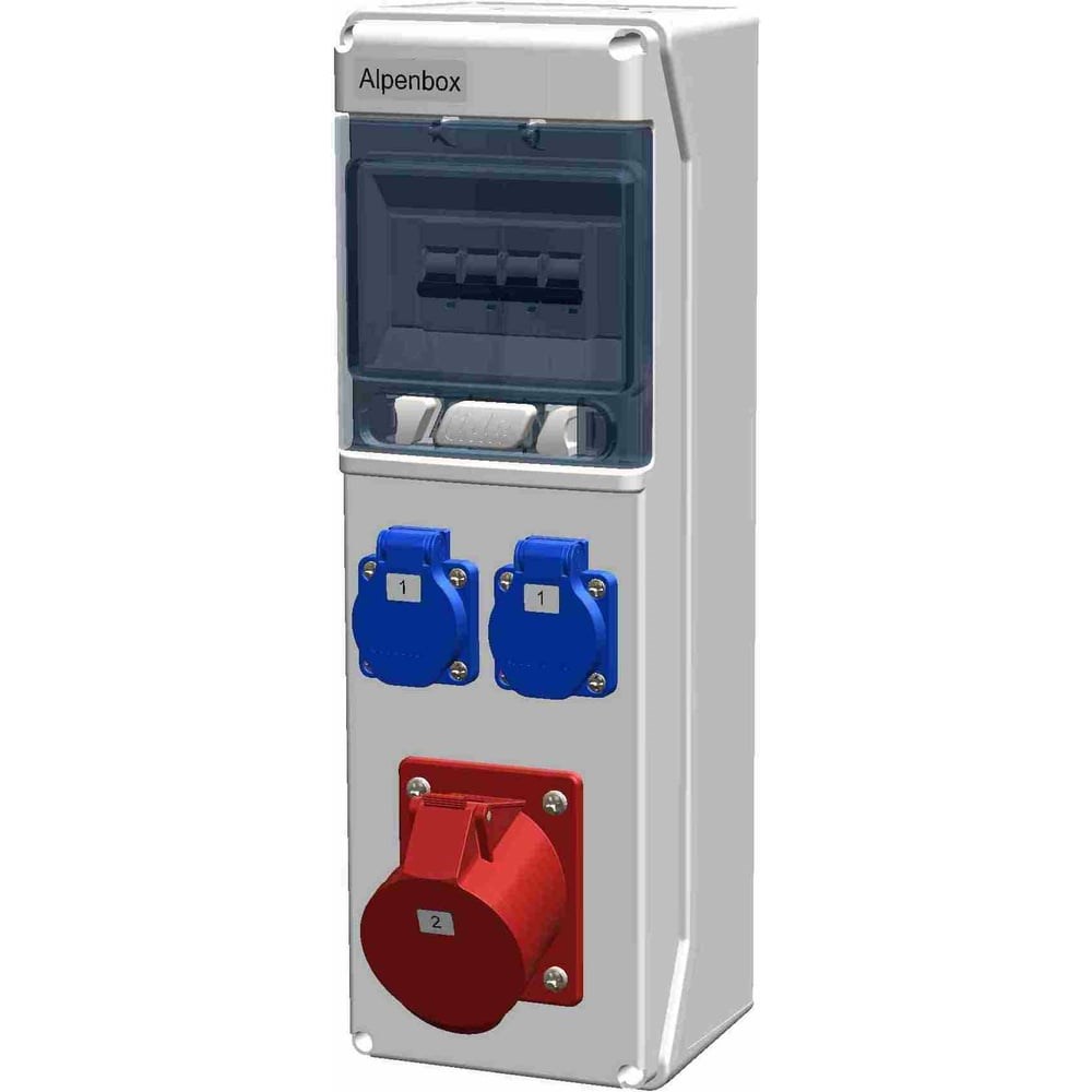 Распределительное устройство ALPENBOX 0060004 РУСп с комбинацией розеток настенного и переносного монтажа в корпусе из ударопрочного безгалогенного пластика ABS оснащено системами защиты и контроля. За счет ударопрочного и атмосферостойкого корпуса устройство можно использовать вне пределов помещений, причем в самых сложных погодных условиях